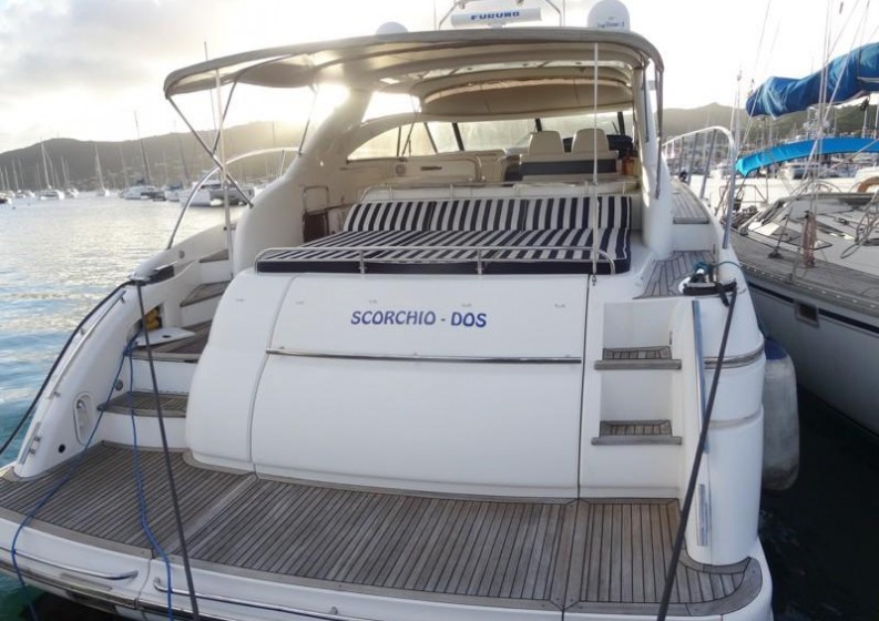 * Self-draining * U-shaped seating/dining area * Cockpit wet bar with refrigerator, barbecue and icemaker * Sunbed aft * Dinghy stowage garage beneath sunbed, with hydraulic lift system * Electric winch dinghy retrieval system * Optional telescopic passearelle * Fender stowage * Life raft storage * Access hatch to lazarette stowage space with gas strut support * Access hatch to engine room with gas strut support * 220/240v shore support inlet in locker * Stowage lockers * Folding hood forward (can extend as sun canopy or complete enclosure), sun awning with side screens aft * Overall tonneau cover * Stainless-steel grabrails * Radar arch * Cockpit lighting * Transom door leading to integral bathing platform with hot and cold transom shower, foldaway swimming ladder and teak decking. Optional sunroof GRP sunroof with opening fabric centre section (electrically operated), removable side windows, tonneau cover aft with zip door.